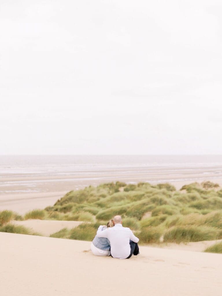 Newlyweds Lauren and Mark sit in the beach dunes during their engagement photo session with Heledd Roberts Photography